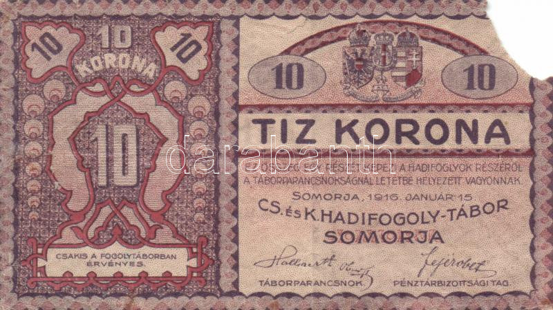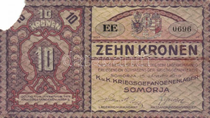 Somorja/hadifogolytábor 1916. 10K T:III-(sarokhiány) https://www.darabanth.com/hu/169-Gyorsarveres/169.0/Numizmatika/Magyar-es-kulfoldi-papir-es-fem-szuksegpenzek-penzhelyettesitok-~4000127/Somorjahadifogolytabor-1916-10K-TIII-sarokhiany~II567606