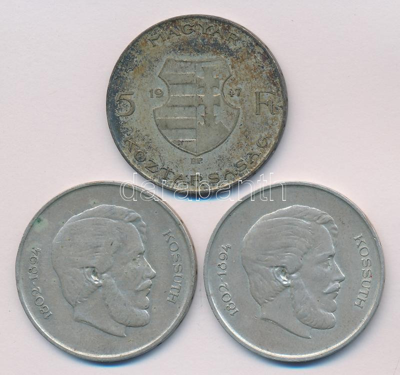1947. 5Ft Ag "Kossuth" (3x) T:2-,3 https://www.darabanth.com/hu/169-Gyorsarveres/169.0/Numizmatika/Magyar-fem-es-ezustpenzek~4000129/1947-5Ft-Ag-Kossuth-3x-T2-3~II568146