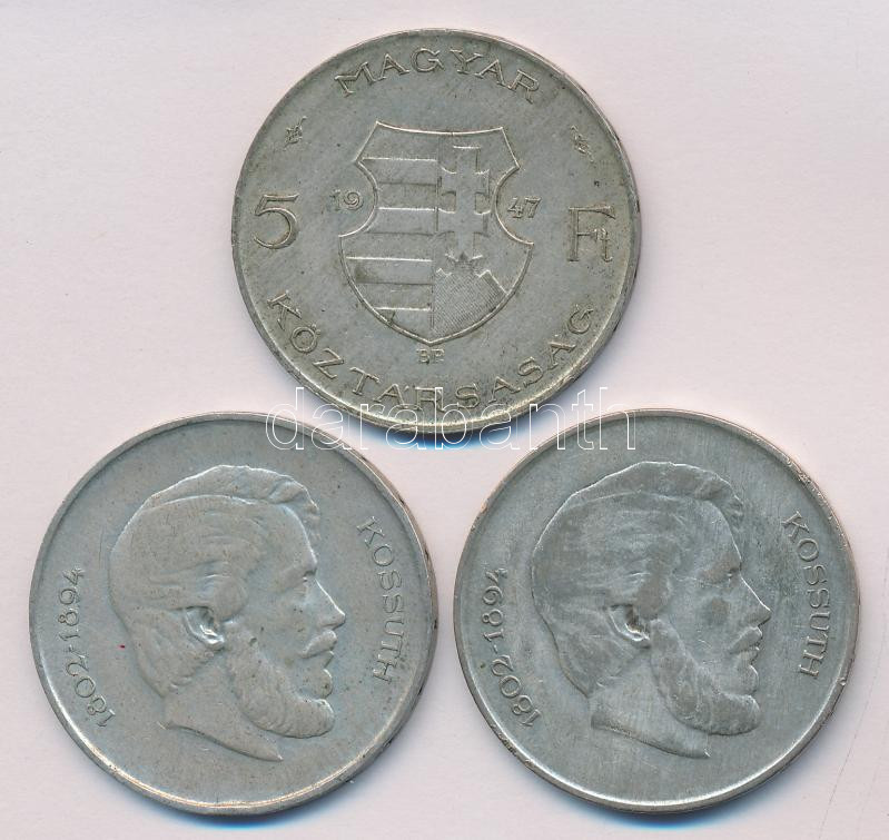 1947. 5Ft Ag "Kossuth" (3x) T:3 https://www.darabanth.com/hu/169-Gyorsarveres/169.0/Numizmatika/Magyar-fem-es-ezustpenzek~4000129/1947-5Ft-Ag-Kossuth-3x-T3~II568144