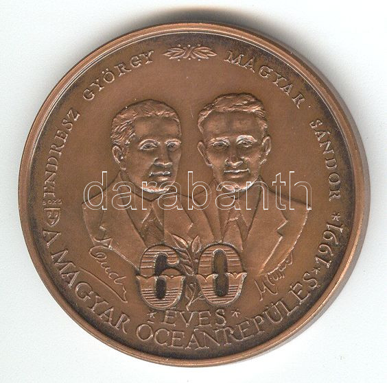 Leírás: 1991. "60 éves a magyar óceánrepülés - Endresz Gy.-Magyar S." Br emlékérem (42,5mm) szign.:Bozó T:1