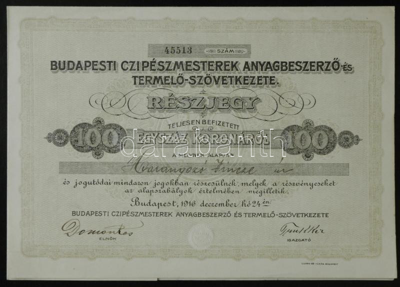 1916. Budapesti Cipészmesterek Anyagbeszerző-és Termelő Szövetkezeténe... https://www.darabanth.com/hu/169-Gyorsarveres/169.0/Numizmatika/Reszvenyek-es-sorsjegyek~4000126/1916-Budapesti-Cipeszmesterek-Anyagbeszerzo-es-Termelo-Szovetkezetenek-reszjegye-100K-rol-s~II485704