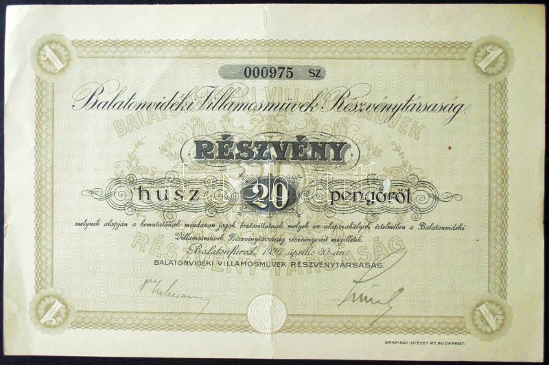 Leírás: Balatonfüred 1926. "Balatonvidéki Villamosművek Részvénytársaság" részvénye 20P-ről