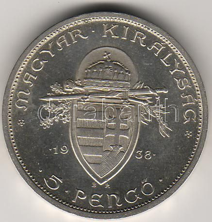 1938 5P "Szt.István" ezüst T:1/2! https://www.darabanth.com/hu/17-Gyorsarveres/17.0/Numizmatika/Fempenzek~138/1938-5P-SztIstvan-ezust-T12~II27693