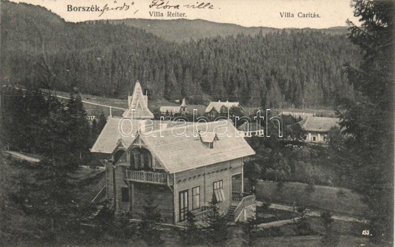 Borszék, Villa Reiter, Villa Caritás; Soós kiadása https://www.darabanth.com/hu/17-Nagyaukcio/17.1/Magyar-kepeslapok/Erdely~5483/Borszek-Villa-Reiter-Villa-Caritas-Soos-kiadasa~II788015