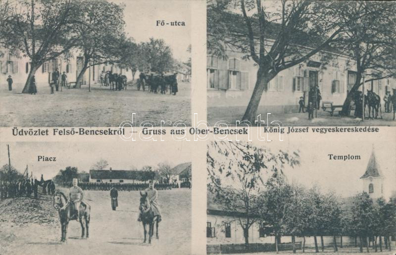 Felsőbencsek, Main street, König József's shop, market, church (EK) https://www.darabanth.com/hu/17-Nagyaukcio/17.1/Magyar-kepeslapok/Erdely~5483/Felsobencsek-Main-street-Konig-Jozsefs-shop-market-church-EK~II791429
