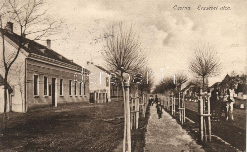 Csorna, Erzsébet utca; Berger testvérek kiadása https://www.darabanth.com/hu/17-Nagyaukcio/17.1/Magyar-kepeslapok/Magyarorszag~5482/Csorna-Erzsebet-utca-Berger-testverek-kiadasa~II781435