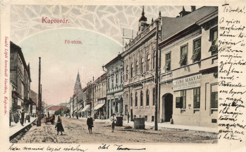 Leírás: Kaposvár, Fő utca, Első Magyar Biztosítótársaság főügynöksége; Szabó Lipót kereskedő kiadása