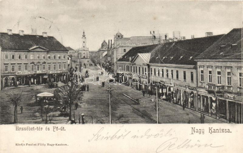 Nagykanizsa, Erzsébet tér, Főút; kiadja Fischel Fülöp https://www.darabanth.com/hu/17-Nagyaukcio/17.1/Magyar-kepeslapok/Magyarorszag~5482/Nagykanizsa-Erzsebet-ter-Fout-kiadja-Fischel-Fulop~II781225