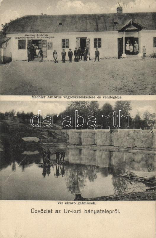 Leírás: Úrkút Bányatelep, Mechler Ambrus vegyeskereskedése és vendéglője, víz elzáró gátművek