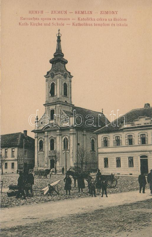 Zimony, Katolikus templom és iskola / church, school https://www.darabanth.com/hu/17-Nagyaukcio/17.1/Magyar-kepeslapok/Vajdasag~5487/Zimony-Katolikus-templom-es-iskola-church-school~II786612