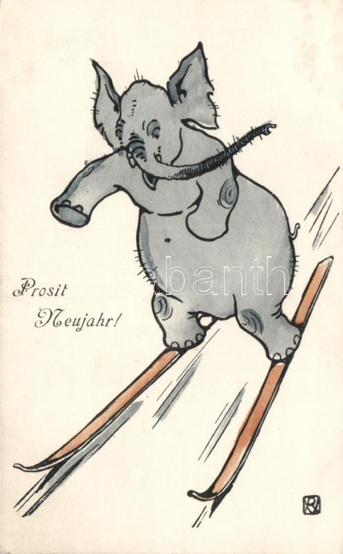 New Year, skiing elephant H.H.i.W. Nr. 1119. https://www.darabanth.com/hu/17-Nagyaukcio/17.1/Motivum-kepeslapok/Allat~5594/New-Year-skiing-elephant-HHiW-Nr-1119~II778994