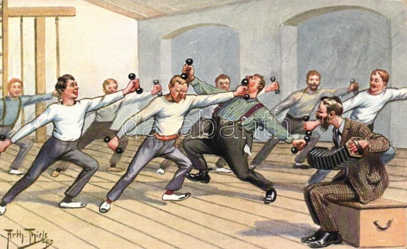 In the Gym, humour 'T.S.N. Serie 1816' s: Arthur Thiele https://www.darabanth.com/hu/17-Nagyaukcio/17.1/Motivum-kepeslapok/Sport~5555/In-the-Gym-humour-TSN-Serie-1816-s-Arthur-Thiele~II793276