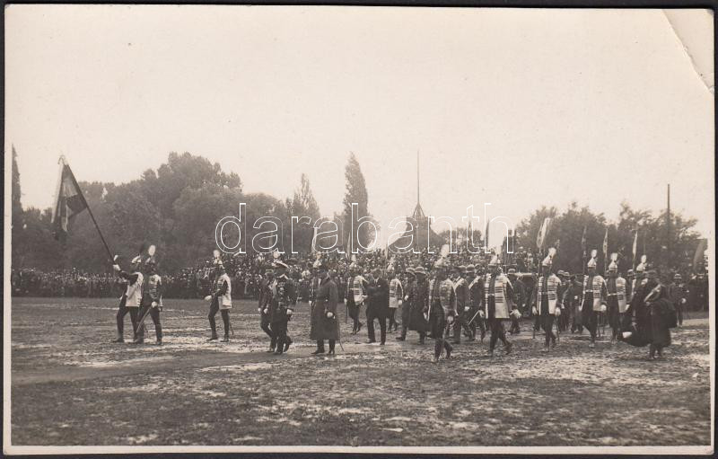 cca 1930 Budapest, Vérmező: Horthy Miklós parádén mellette a koronaőrség tagjai és a filmhíradó. Fotólap / cca 1930 Horthy and the crown-guards photo card