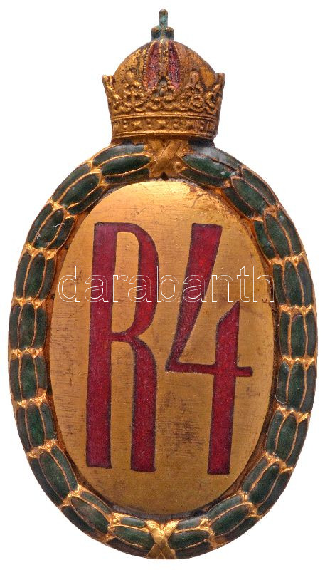 Leírás: Osztrák-Magyar Monarchia ~1916. "R4" 4. Ulánus Lovas Lövészezred aranyozott, zománcozott sapkajelvény (42x24mm) T:2
