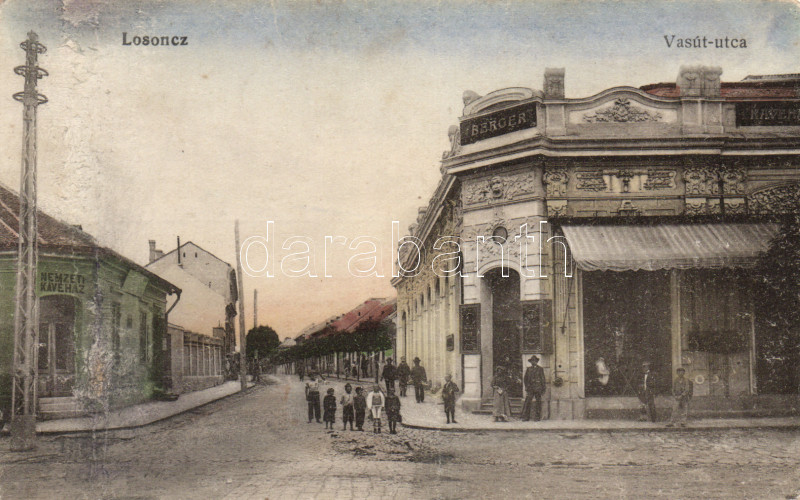 Losonc Railway street, Café Berger, Café National (fa) https://www.darabanth.com/hu/170-Gyorsarveres/170.0/Kepeslapok/Felvidek~200007/Losonc-Railway-street-Cafe-Berger-Cafe-National-fa~II574487