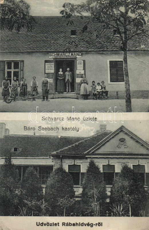 Rábahídvég Schwarcz Manó üzlete, Báró Seebach-kastély (fa) https://www.darabanth.com/hu/170-Gyorsarveres/170.0/Kepeslapok/Magyarorszag~200005/Rabahidveg-Schwarcz-Mano-uzlete-Baro-Seebach-kastely-fa~II574374