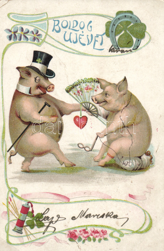 New Year pig couple, Art Nouveau litho (EK) https://www.darabanth.com/hu/170-Gyorsarveres/170.0/Kepeslapok/Udvozlolap~500111/New-Year-pig-couple-Art-Nouveau-litho-EK~II574197