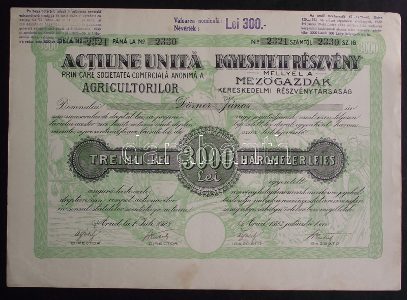 Románia / Arad 1923. Mezőgazdák Kereskedelmi Részvénytársaság egyesített részvénye 3000L-ről szelvényekkel