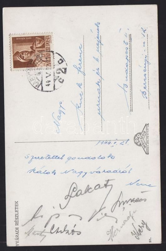 Leírás: 1944 FTC labdarúgók aláírása nagyváradi képeslapon: Lakat, Kéry, Csikós, Hernádi, stb.