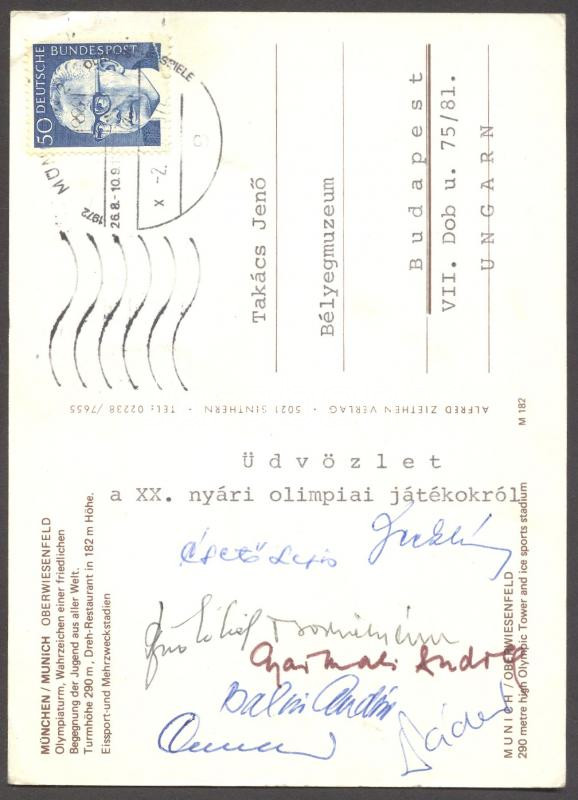 Leírás: 1972 XX. Olimpia München képeslap, olimpikonok aláírásával: Gyarmati Andrea, Balczó András stb.