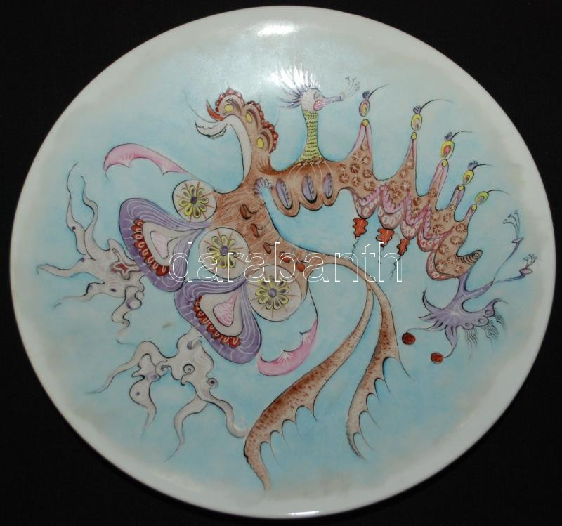 Leírás: Simó Ágoston (1925-2011): Állat és virág, egyedi mintázatú, kézzel festett, jelzett dísztányér /