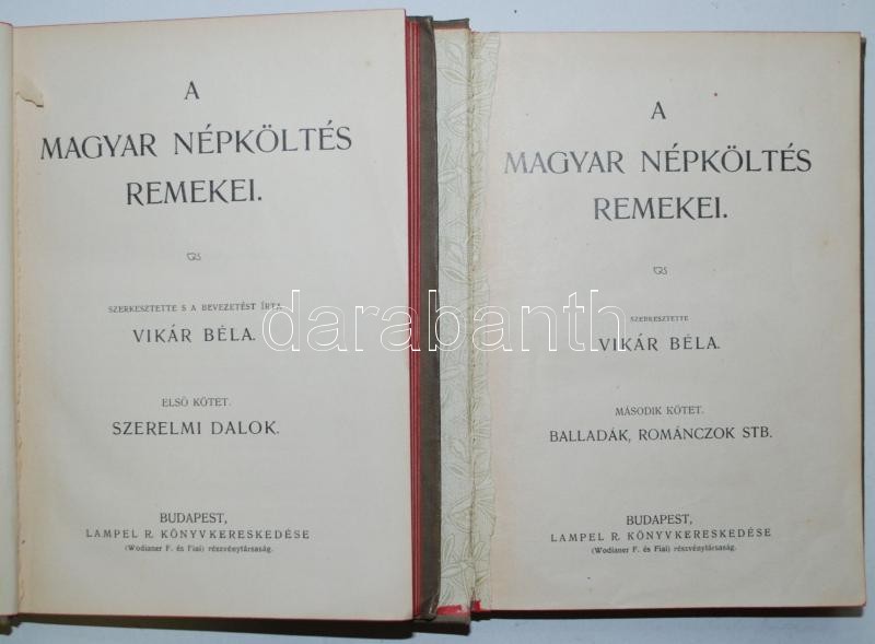 A magyar népköltés remekei I-II. (Remekírók Képes Könyvtára) Szerk. bev. Vikár Béla. Bp., 1907, Lampel R. (Wodianer F. és Fiai). Leszik-féle szecessziós aranyozott egészvászon kötésben, kortárs művészek illusztrációival, jó állapotban (a 2. kötet előzéklapja hiányzik)