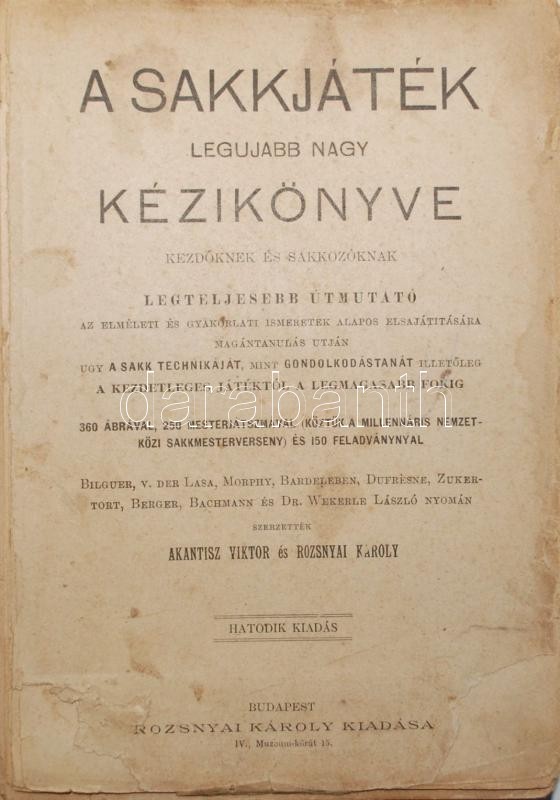 Akantisz Viktor - Rozsnyai Károly: A sakkjáték legujabb nagy kézikönyve kezdőknek és sakkozóknak. 360 ábrával, 250 mesterjátszmával és 150 feladvánnyal. Bp., é.n., Rozsnyai Károly kiadása. Festett egészvászon kötésben, megviselt állapotban