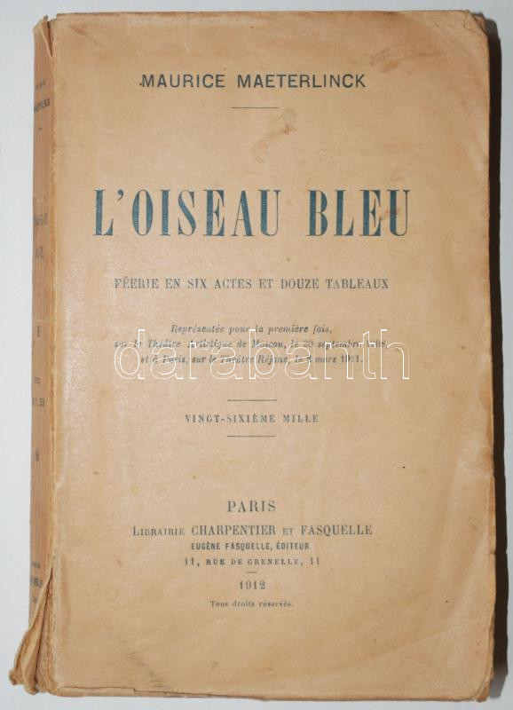 Maurice Maeterlinck: L'oiseau bleu. Féerie en six actes et douze tableaux. Paris, 1912, Librairie Charpentier et Fasquelle. Kiadói papírkötésben /