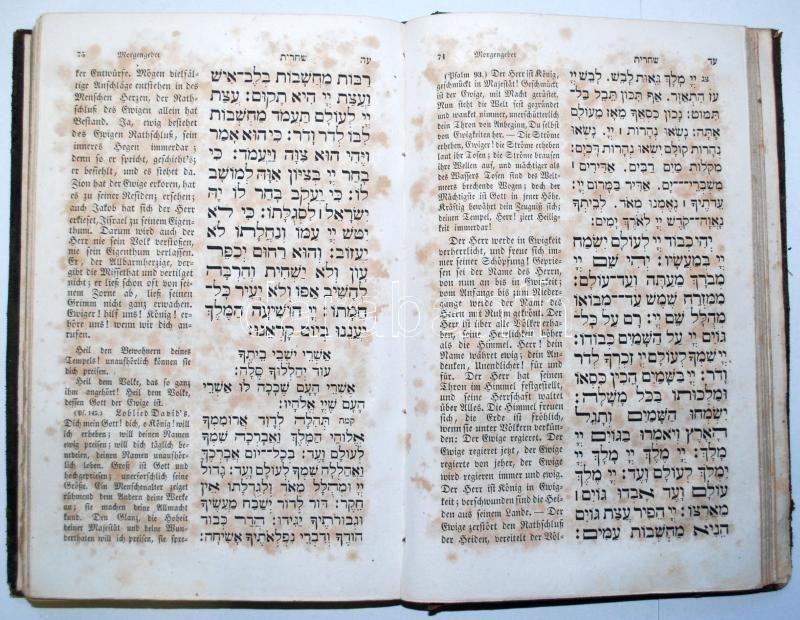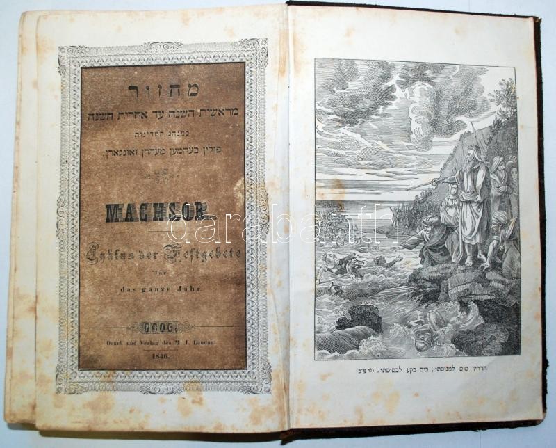 Machsor. Cyklus der Festgebete für das ganze Jahr. Gebete für den ersten und zweiten Tag des Pessachfestes. Übers.: M. I. Landau. Prag, 1846, M. I. Landau. Héber-német imádságos könyv, dombornyomott aranyozott egészbőr kötésben, a címlapon fametszettel /