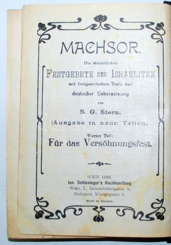 Machsor. Die sämmtlichen Festgebete der Israeliten mit bestgeordnetem Texte und deutscher Uebersetzung v. S. G. Stern. Bd. IV: Für das Versöhnungsfest. Wien, 1926, Jos. Schlesinger's Buchhandlung. Egészvászon kötésben /