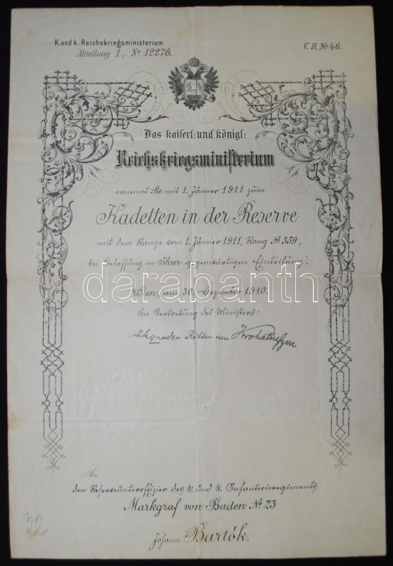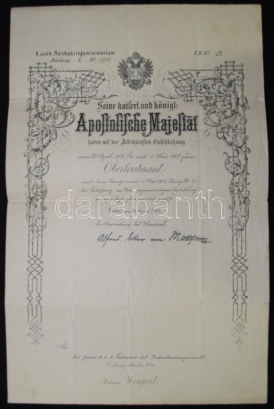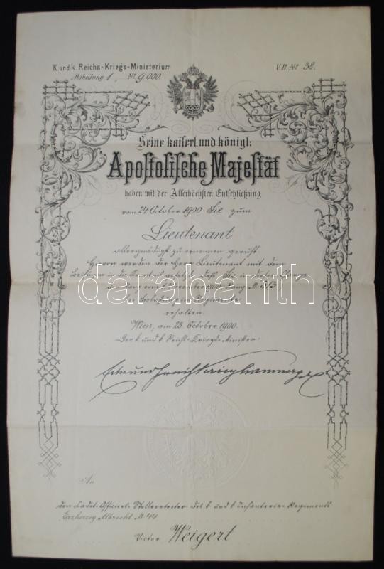 1900-1911 Császári és Királyi Honvédelmi Minisztérium: Hadnagyi és Főh... https://www.darabanth.com/hu/171-Gyorsarveres/171.0/Festmeny-mutargy-papirregiseg-egyeb/Militaria~1000002/1900-1911-Csaszari-es-Kiralyi-Honvedelmi-Miniszterium-Hadnagyi-es-Fohadnagyi-kinevezesene~II579405