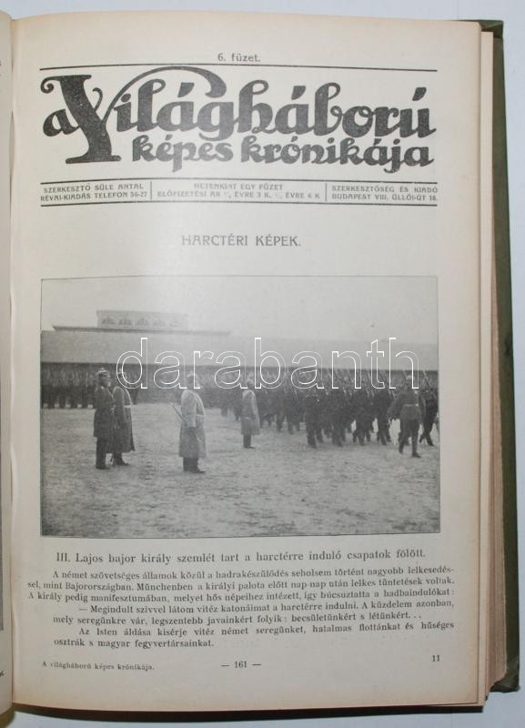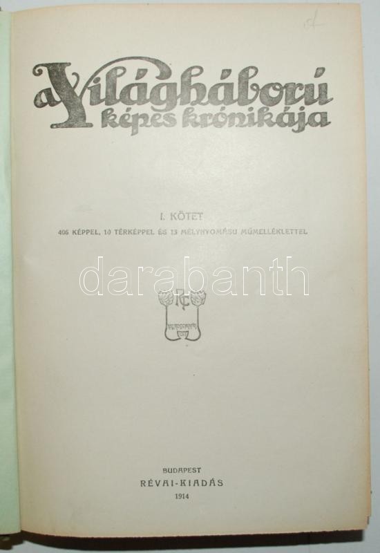 1914 A világháború képes krónikája. I. köt. 406 képpel, 10 térképpel és 13 mélynyomású műmelléklettel. Bp., 1914, Révai. Egybekötve kiadói festett egészvászon kötésben, rengeteg fotóval, jó állapotban