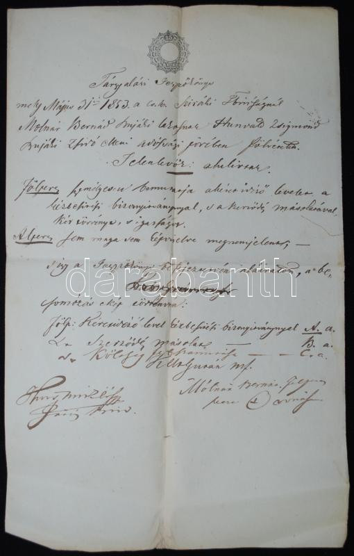 1853 Tárgyalási jegyzőkönyv 15kr szignettával https://www.darabanth.com/hu/171-Gyorsarveres/171.0/Festmeny-mutargy-papirregiseg-egyeb/Okmanyok~1000028/1853-Targyalasi-jegyzokonyv-15kr-szignettaval~II578561