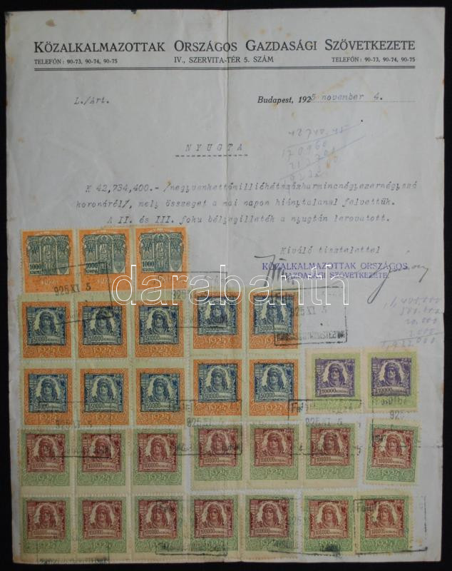 1925 Nyugta Közalkalmazottak Országos Gazdasági Szövetkezete, 29 db il... https://www.darabanth.com/hu/171-Gyorsarveres/171.0/Festmeny-mutargy-papirregiseg-egyeb/Okmanyok~1000028/1925-Nyugta-Kozalkalmazottak-Orszagos-Gazdasagi-Szovetkezete-29-db-illetekbelyeggel~II579311