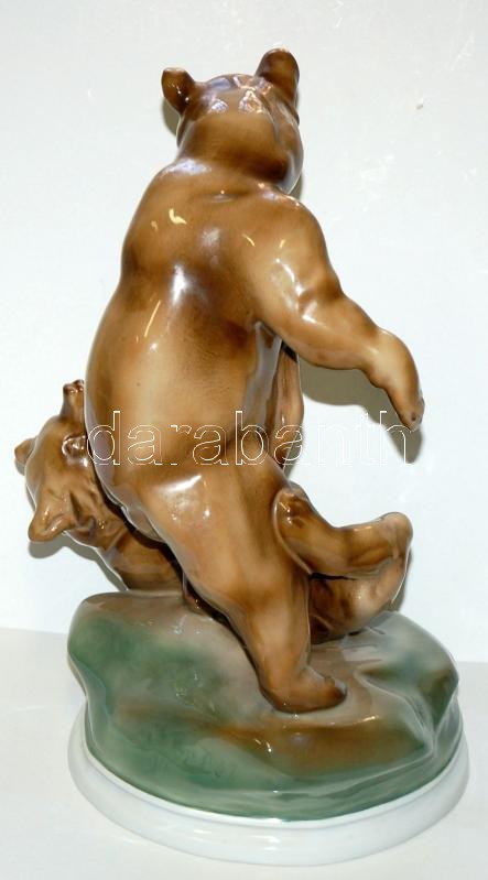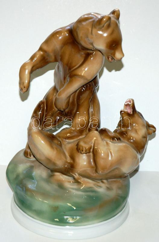 Leírás: Kézzel festett birkózó medvéket ábrázoló nagyméretű jelzett Zsolnay porcelán figura /
