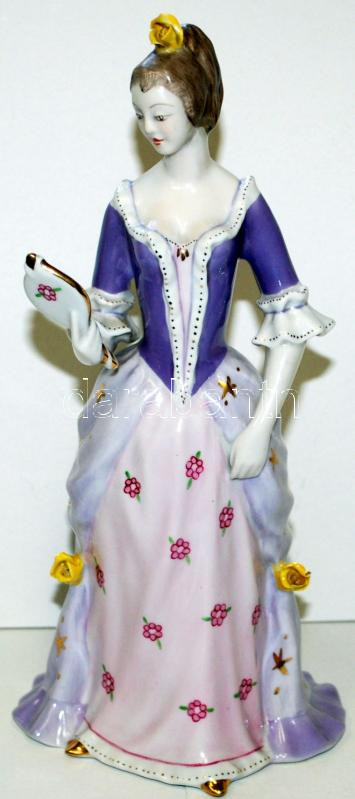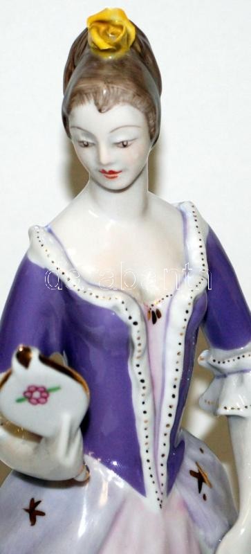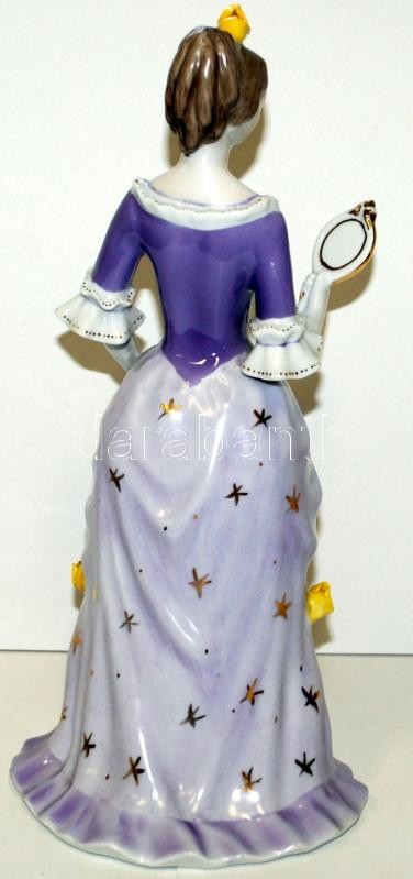 Kézzel festett jelzett Hollóházi porcelán tükröt tartó hölgy figura, az egyik rózsán alig látható sérülés /