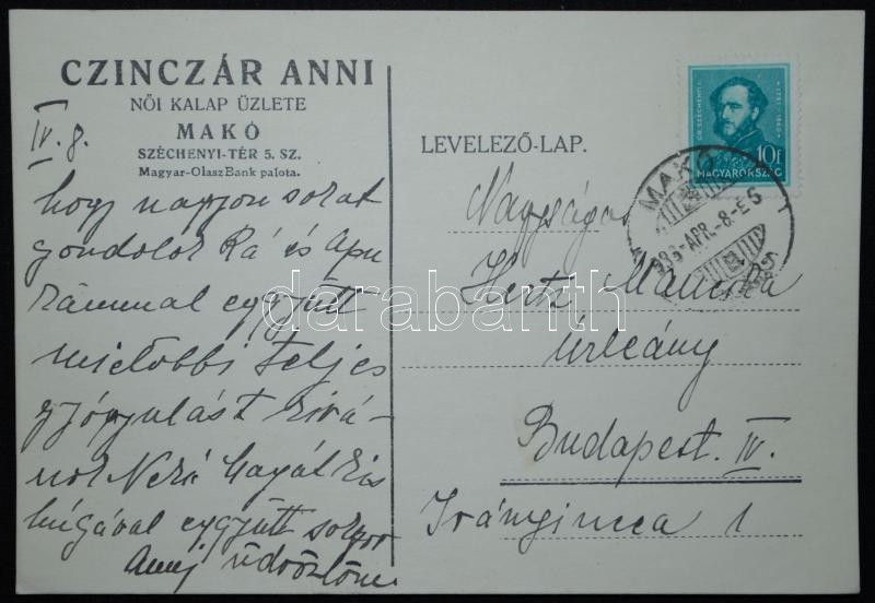 Czinczár Anni női kalap, reklám levelező-lap. https://www.darabanth.com/hu/171-Gyorsarveres/171.0/Festmeny-mutargy-papirregiseg-egyeb/Reklam~1000035/Czinczar-Anni-noi-kalap-reklam-levelezo-lap~II579829