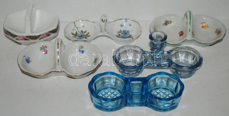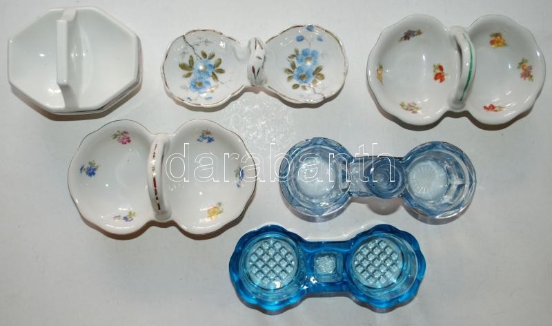 6db-os sótartógyűjtemény üveg-, illetve porcelán sótartókkal, köztük kézzel festettekkel is /