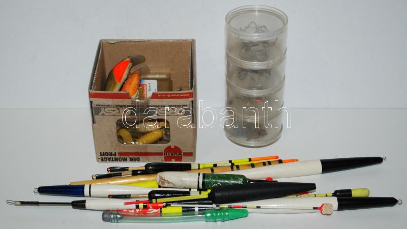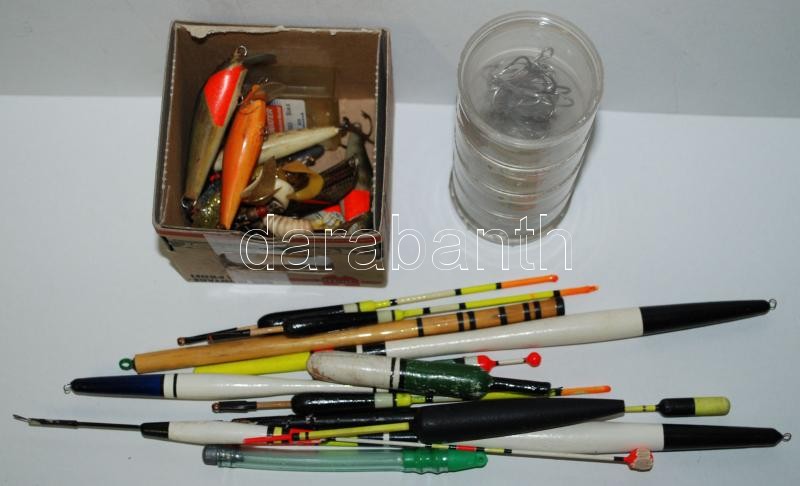 Leírás: Horgász tétel: Úszok, műcsalik, horogtűk stb