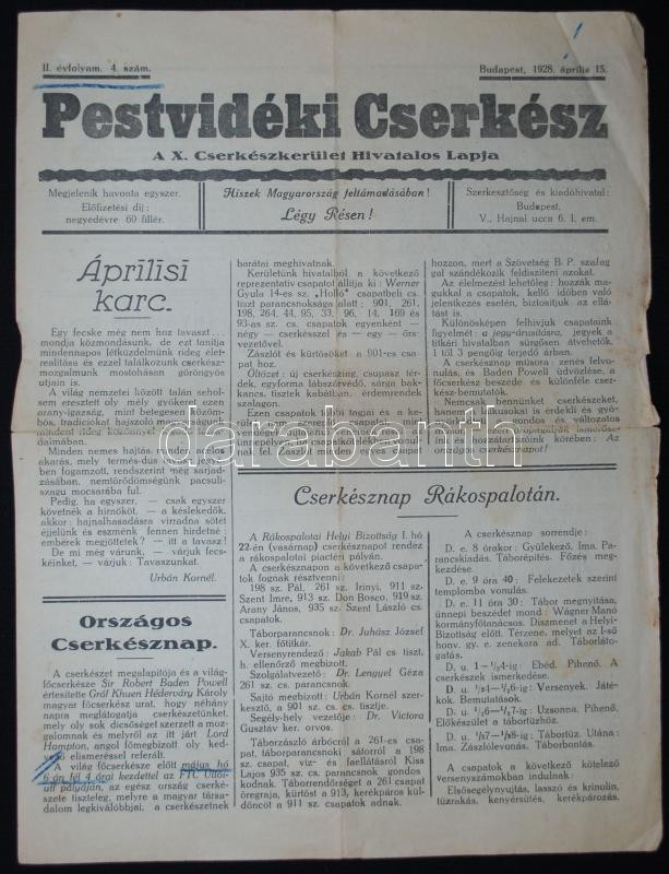 Leírás: 1928 A Pestvidéki cserkész c. újság száma, benne a Leventékhez fűződő viszonyról szóló cikkel