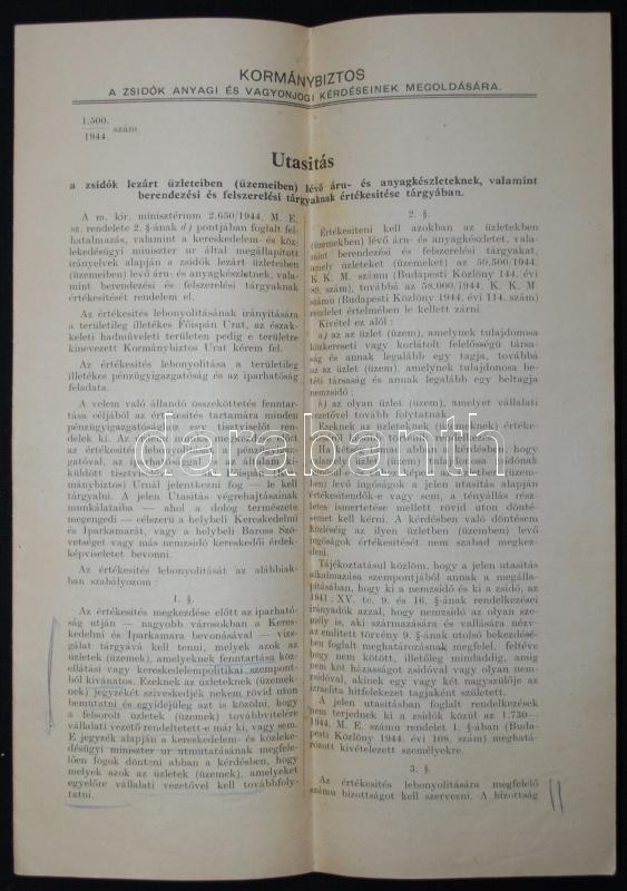 1944 Utasítás a zsidók üzleteiben lévő áru és anyagkészleteknek, valam... https://www.darabanth.com/hu/172-Gyorsarveres/172.0/Festmeny-mutargy-papirregiseg-egyeb/Judaika~500044/1944-Utasitas-a-zsidok-uzleteiben-levo-aru-es-anyagkeszleteknek-valamint-berendezesi-es-~II585267