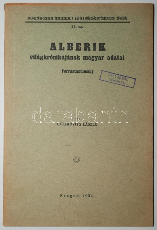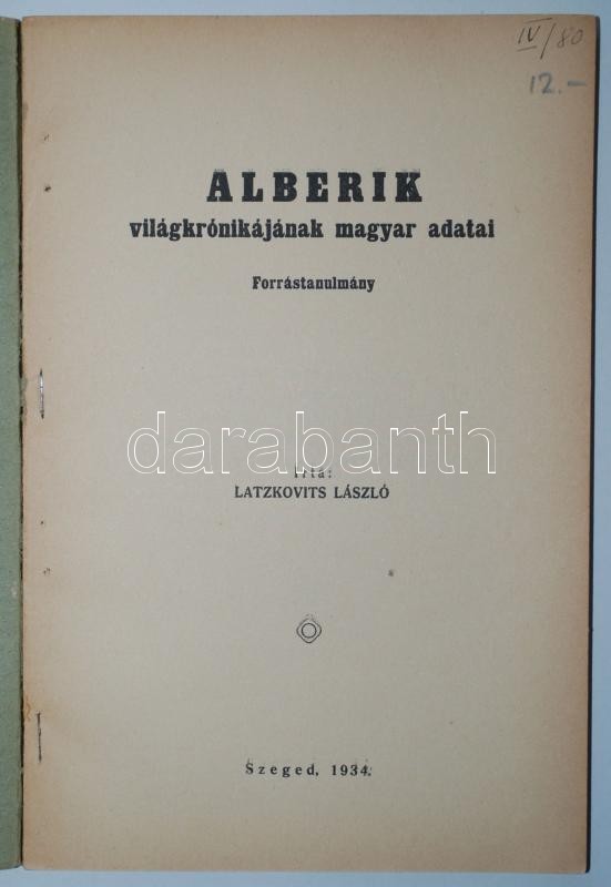 Leírás: Latzkovits László: Alberik világkrónikájának magyar adatai. Forrástanulmány. (Kolozsvári-Szegedi Értekezések A Magyar Művelődéstörténelem Köréből 23, sz.) Szeged, 1934, 92p.