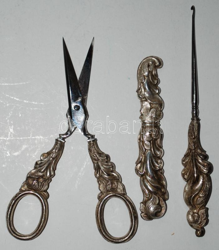 Ezüst (Ag) varró- és horgolókészlet gazdag növényi díszítéssel: olló, ... https://www.darabanth.com/hu/172-Gyorsarveres/172.0/Festmeny-mutargy-papirregiseg-egyeb/Nemesfem-Disztargyak-Orak-es-Ekszerek~500045/Ezust-Ag-varro-es-horgolokeszlet-gazdag-novenyi-diszitessel-ollo-horgolotu-tu-to~II582195