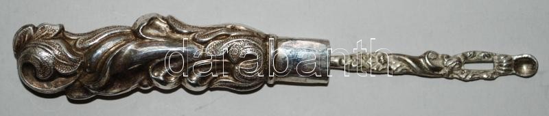 Leírás: Ezüst (Ag) varró- és horgolókészlet gazdag növényi díszítéssel: olló, horgolótű, tű tokban /