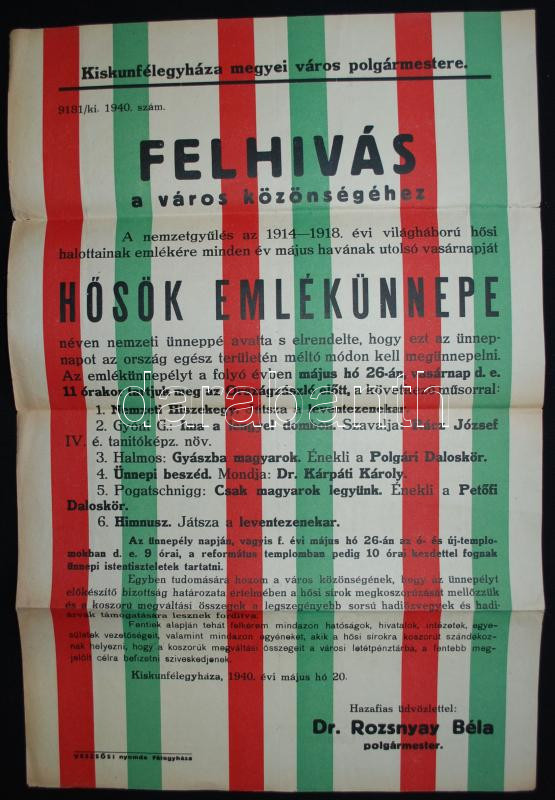 Leírás: 1940 Kiskunfélegyháza felhívás hősök emlékünnepe hirdetmény 32x46 cm