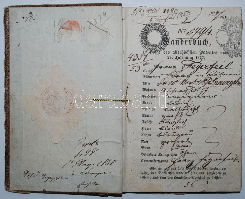 1848 Vándorkönyv, nagyon sok bejegyzéssel https://www.darabanth.com/hu/172-Gyorsarveres/172.0/Festmeny-mutargy-papirregiseg-egyeb/Okmanyok~500015/1848-Vandorkonyv-nagyon-sok-bejegyzessel~II583660