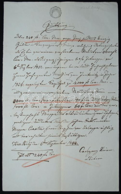 1853 Keszthelyi keltezésű okmány 45kr okirati szignettával (2500) / Do... https://www.darabanth.com/hu/172-Gyorsarveres/172.0/Festmeny-mutargy-papirregiseg-egyeb/Okmanyok~500015/1853-Keszthelyi-keltezesu-okmany-45kr-okirati-szignettaval-2500-Document-from-Keszthely-with~II585255