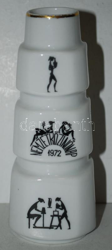Leírás: 1972 Nemzetközi Nőnap alkalmából készült matricás díszítésű porcelán váza, 15,5cm