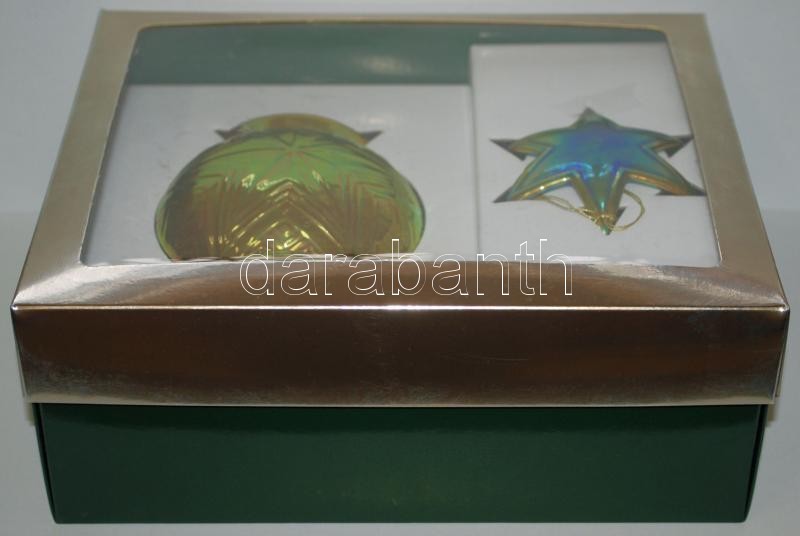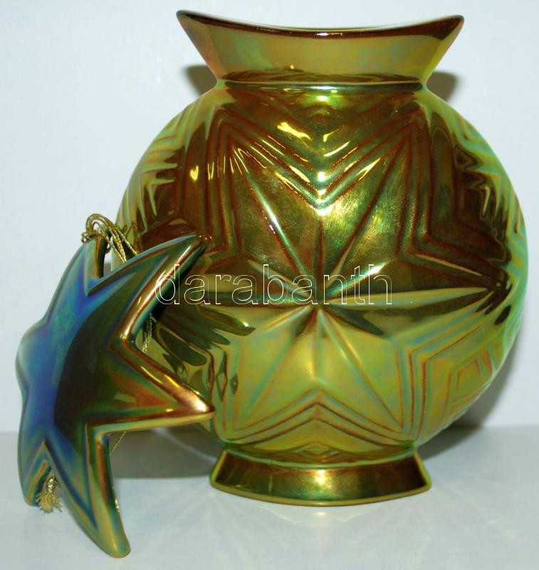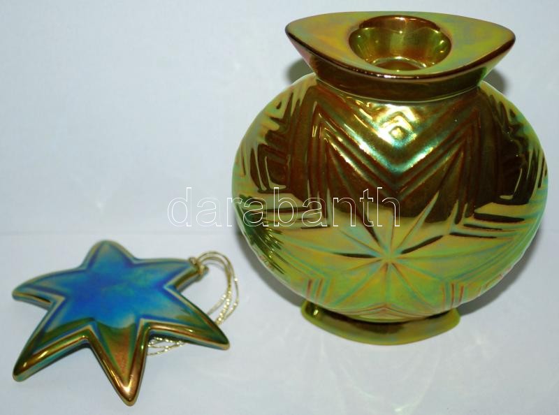 Leírás: Zsolnay eozinos gyertyatartó m:13 cm és csillag m:8 cm, hibátlanok, jelzettek, eredeti dobozában
