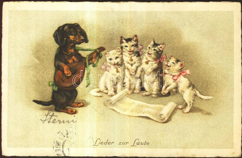 Singing cats, musician dog litho (Rb) https://www.darabanth.com/hu/172-Gyorsarveres/172.0/Kepeslapok/Kutya~5000075/Singing-cats-musician-dog-litho-Rb~II585397